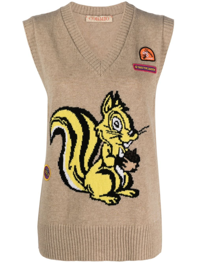 Graphic Patch Sleeveless V-neck Vest In Beige