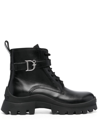 Leather D2 Statement Combat Booties With Logoed Strap In Black