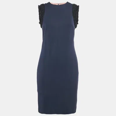 Pre-owned Navy Blue Wool Blend Embellished Sleeve Sheath Dress M