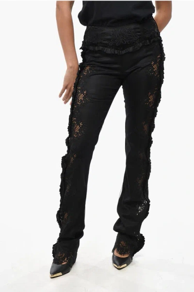 Satin Pants With Lace Inserts And Ruffled Details In Black