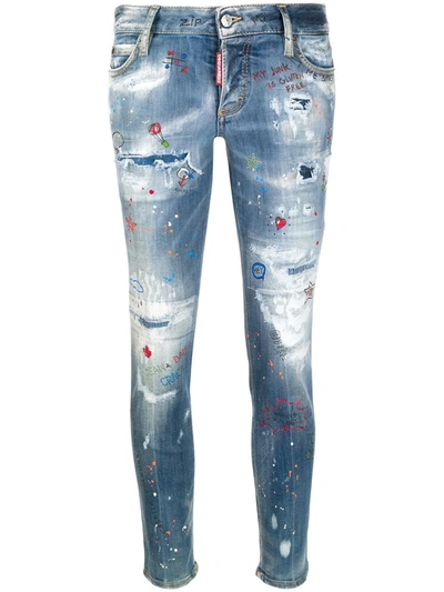 Distressed Faded Five-pocket Belted Jeans In Blue