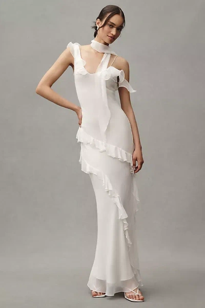 Hemera Silk Chiffon Ruffle Scarf-neck Maxi Dress In White