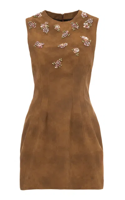 Faux Suede Embroidered A-line Mini Dress In Tan