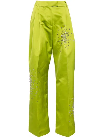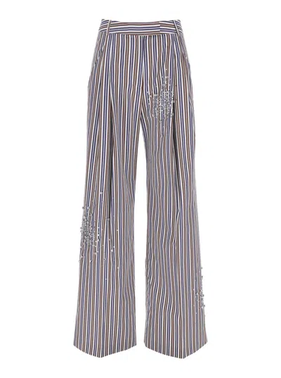 Blue Pants With Faux-pearl Embellishments And All-over Striped Motif In Cotton Woman