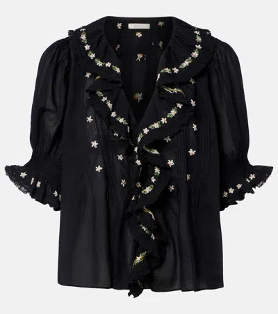 HETTIE花卉刺绣荷叶边棉质女式上衣