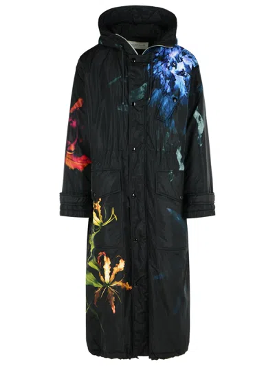Long Floral Pattern Hood Side Pockets Coat In Black