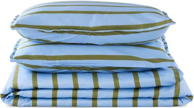 Blue & Khaki Cornflower Stripe Duvet Set, Full/queen