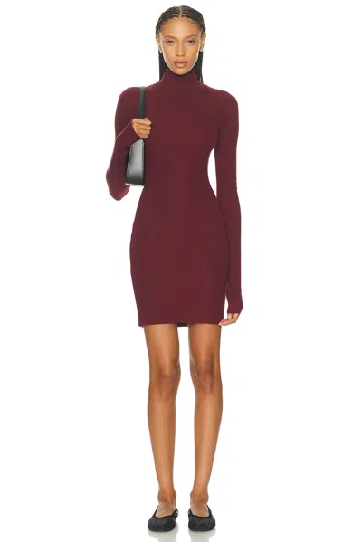 Long Sleeve Ruched Turtleneck Butter Rib Mini Dress In Brown