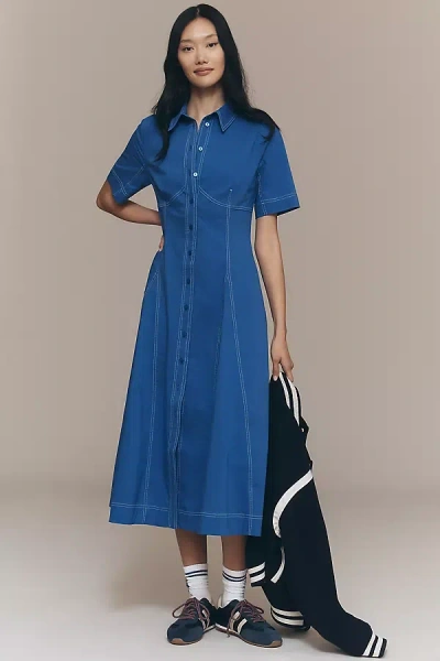 Short-sleeve Seamed Pleated Midi Dress In Blue