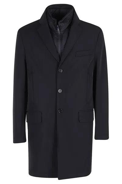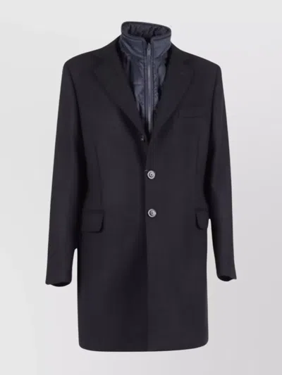 Layered Navy Blue Coat With Button Fastening And Flap Pockets In Black