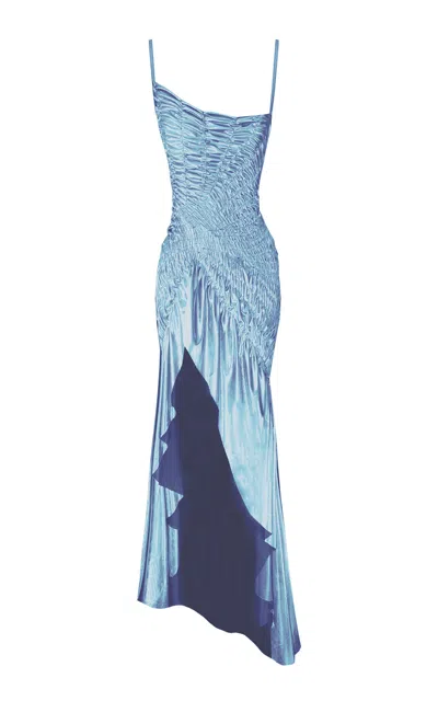 Celestial Shirred Satin Midi Dress In Blue