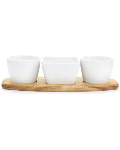 Gracious Dining 4 Piece Fine Ceramic Tidbit Dish Set With Acacia Wood Base In White