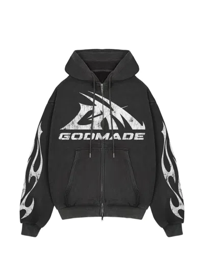 Mens Washed Grey Logo-print Zip-up Cotton Hoody In Black