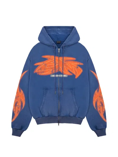 Mens Washed Blue Logo-print Zip-up Cotton Hoody