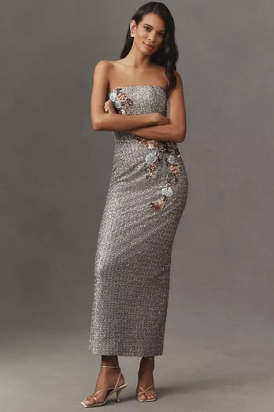 Silvia Strapless 3d Floral Strapless Stretch Sequin Maxi Dress In Silver