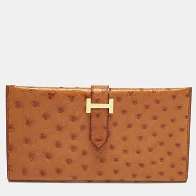 Pre-owned Bearn Natural Sable Ostrich Continental Wallet In Brown