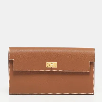Pre-owned Kelly Pocket Gold Madame Leather Long Wallet In Brown
