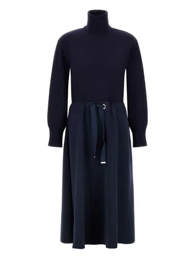 Blue Crewneck Midi Dress With Elastic Drawstring Waist And Panelled Design In Multicolor