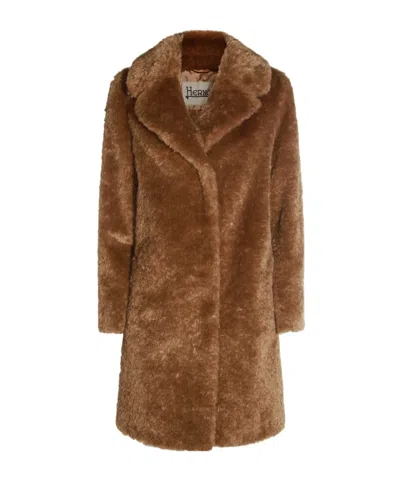 Plush Faux Fur Jacket With High Collar And Buckle Closure In Brown