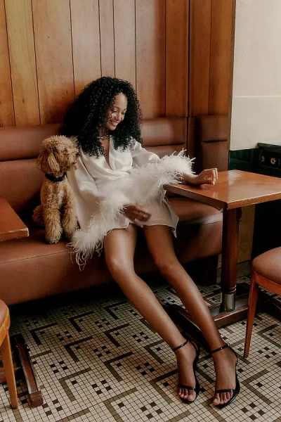 Faux-feather Trim Satin Wrap Mini Dress In Neutral