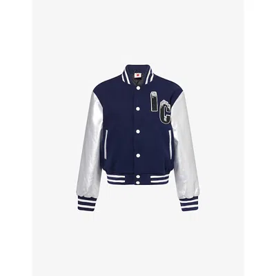 Womens Navy Silver Cherry Embroidered Woven Varsity Jacket Xs In Blue