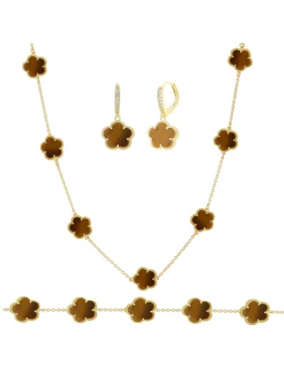 Women's Flower 2-piece 14k Goldplated, Tiger Eye & Oynx Bracelet Set In Brass