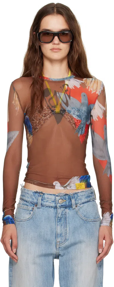 Brown Mesh Long Sleeve T-shirt