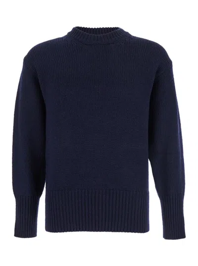 Blue Crewneck Sweater With Ribbed Trims In Wool Man