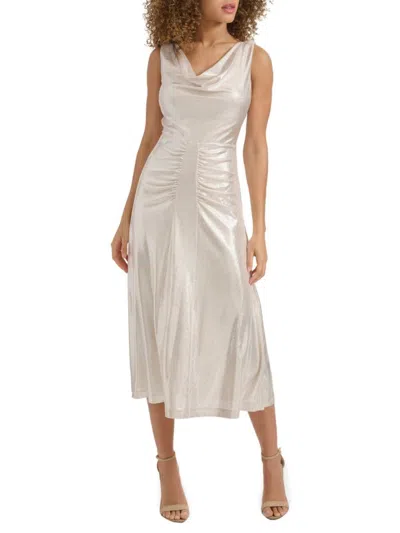 Draped Metallic Jersey Midi Dress In Gold