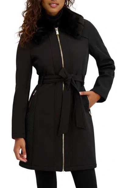 Faux Fur Collar Water Resistant Belted Softshell Jacket In Black
