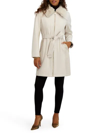 Faux Fur Collar Water Resistant Belted Softshell Jacket In Neutral