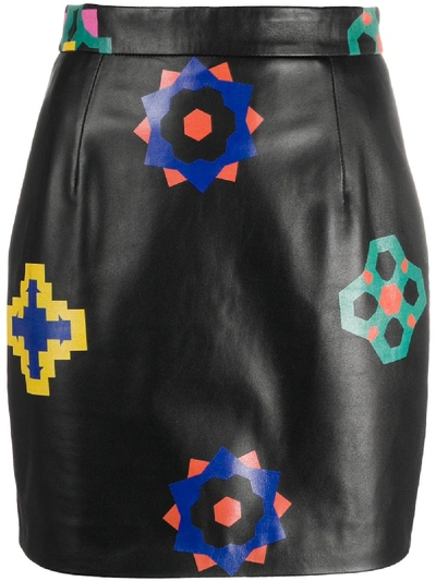 印花皮革高腰迷你半身裙