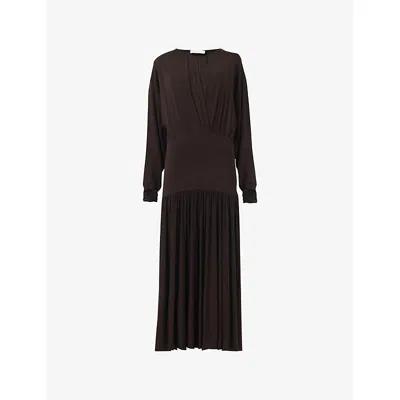 Womens Batwing-sleeve Gathered Stretch-woven Midi Dress In Brown