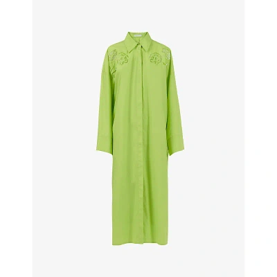 Womens Green Embroidered-shoulder Long-sleeve Cotton-blend Midi Dress