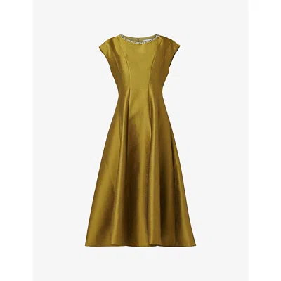 Womens Green Crystal-embellished Flared Satin Midi Dress In Metallic