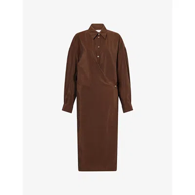 Silk Midi Dress With Wrap-style Front And Shirt Collar In Brown