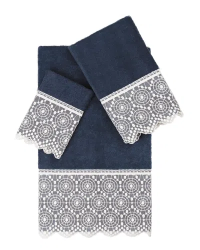 100% Turkish Cotton Arian 3pc Cream Lace Embellished Towel Set In Navy