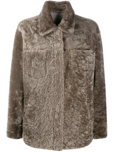 Single-breasted Shearling Coat In Brown