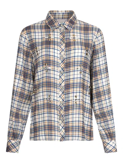 White Cotton Poplin Shirt With Black Floral Print And Rhinestone Details