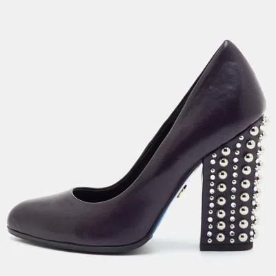 Pre-owned Size 35.5 Dark Purple Leather Crystal Studded Block Heel Pumps