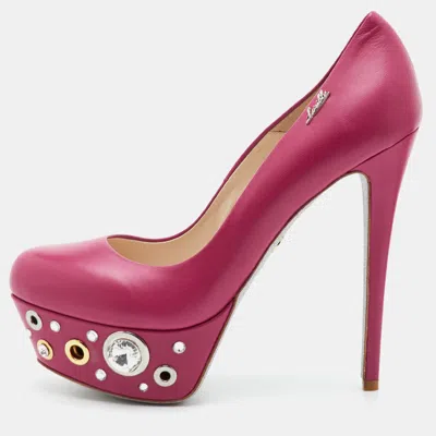 Pre-owned Size 39 Pink Leather Eyelet Crystal Embellished Platform Pumps