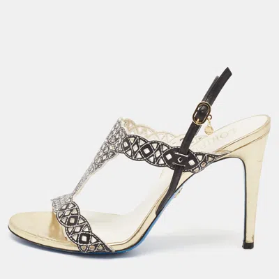 Pre-owned Gold Leather Crystal Embellished Ankle Strap Sandals Size 38