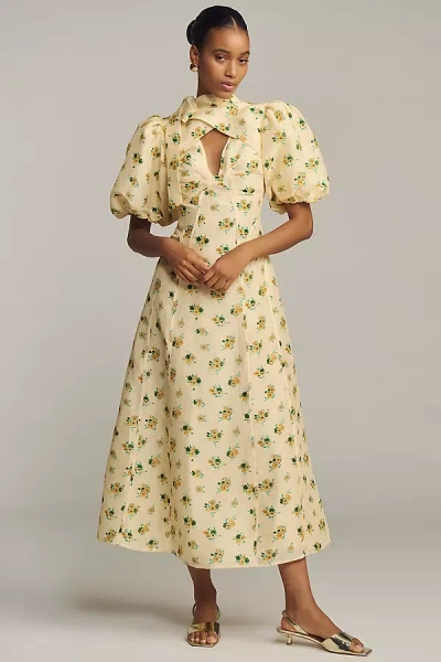 Boehm Linen-silk Puff-sleeve V-neck Midi Dress In Brown