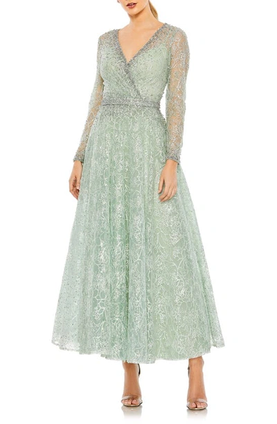 Long Sleeve Embellished Illusion Evening Gown In Grey