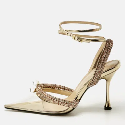 Pre-owned Double Bow Size 41 Metallic Gold Glitter Crystal Embellished Ankle Strap Pumps