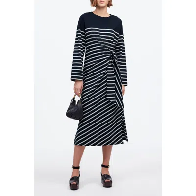 Stripe Side Tie Long Sleeve Knit Maxi Dress In Dark Navy
