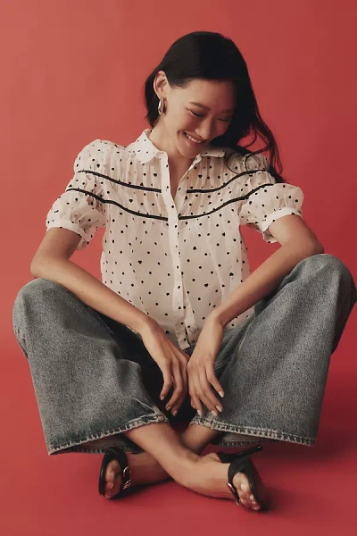 Puff-sleeve Studded Placket Blouse In Neutral