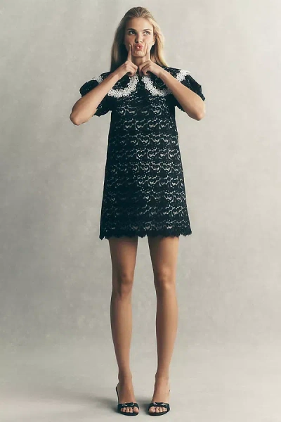 Puff-sleeve Collared Lace Mini Dress In Blue