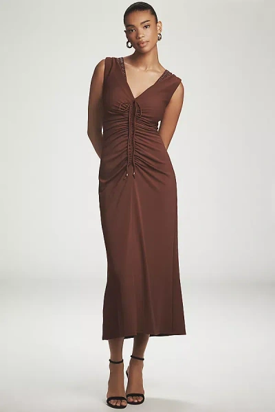 Sleeveless V-neck Studded Ruched Midi Dress In Brown