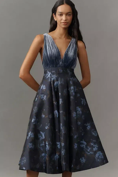 V-neck Velvet Jacquard A-line Midi Dress In Blue